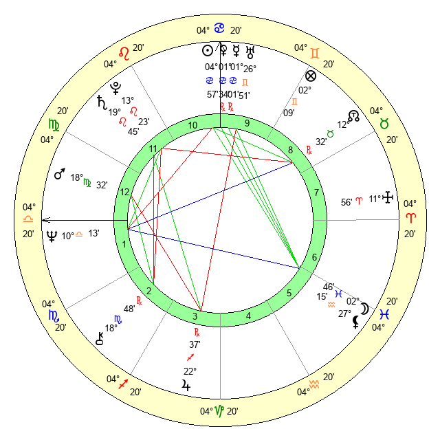 | Sun | 4 Cancer 58 | 5 Cancer 20 | 18 Virgo 51 |