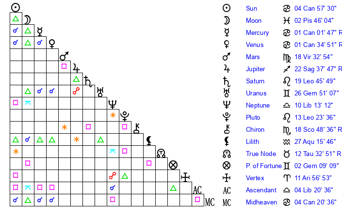 | Moon | 2 Pisces 43 | 22 Cancer 20 | 5 Capricorn 19 |