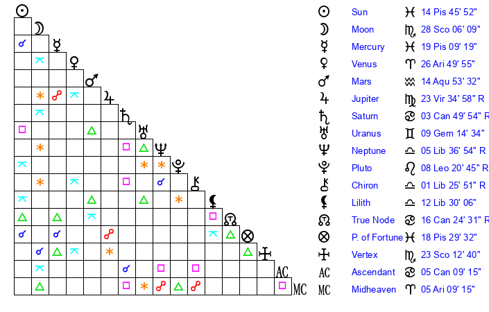 | Sun | 14 Pisces 46 | 15 Pisces 22 | 3 Gemini 8 |