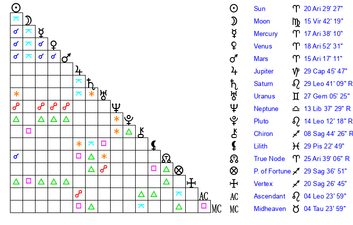 | Venus | 18 Aries 53 | 24 Pisces 45 | 22 Cancer 21 |