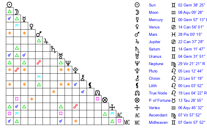 | Saturn | 14 Gemini 28 | 29 Pisces 52 | 24 Gemini 14 |
