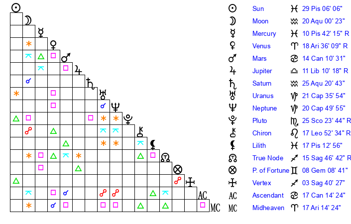 | Saturn | 25 Aquarius 16 | 22 Pisces 55 | 28 Aquarius 14 |
