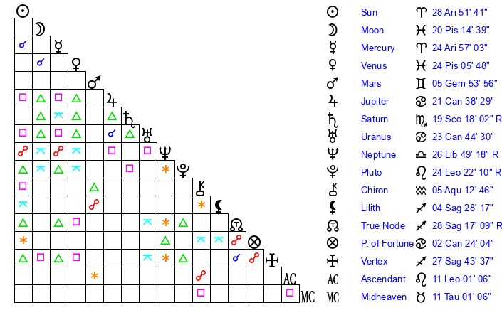 | Saturn | 19 Scorpio 49 | 26 Pisces 34 | 15 Scorpio 22 |