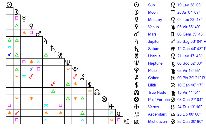| Sun | 19 Leo 38 | 19 Leo 55 | 23 Libra 0 |