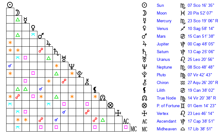 | Sun | 7 Scorpio 17 | 7 Scorpio 31 | 13 Capricorn 6 |