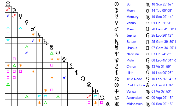 | Sun | 18 Scorpio 26 | 19 Scorpio 33 | 11 Aquarius 44 |