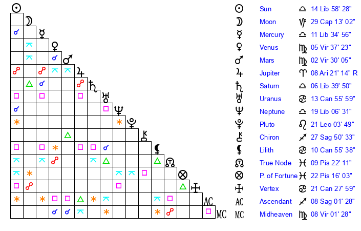 | Sun | 14 Libra 58 | 16 Libra 2 | 29 Sagittarius 24 |
