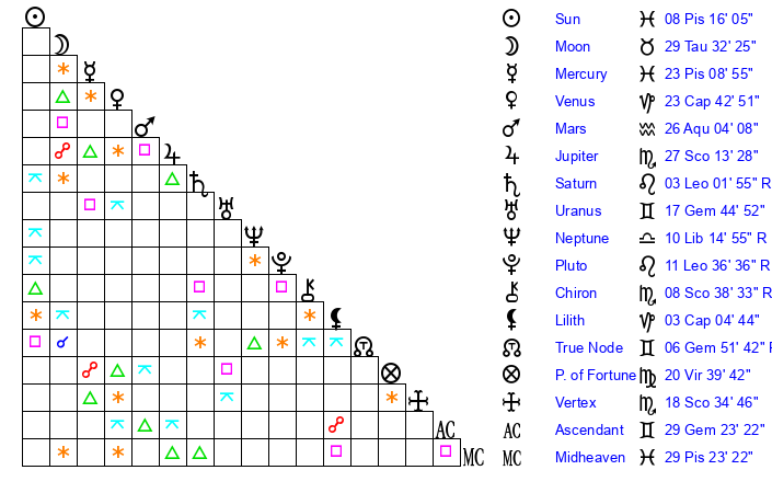 | Sun | 8 Pisces 16 | 9 Pisces 21 | 24 Taurus 59 |