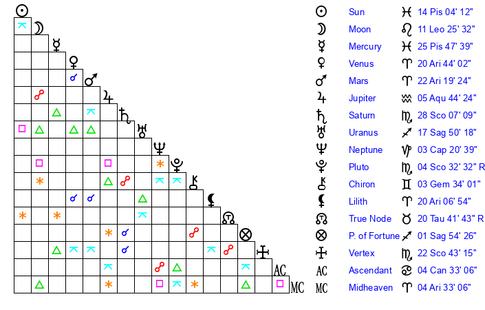 | Moon | 11 Leo 25 | 18 Taurus 21 | 11 Aquarius 37 |