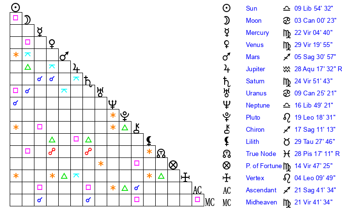 | Sun | 9 Libra 54 | 10 Libra 44 | 25 Sagittarius 12 |