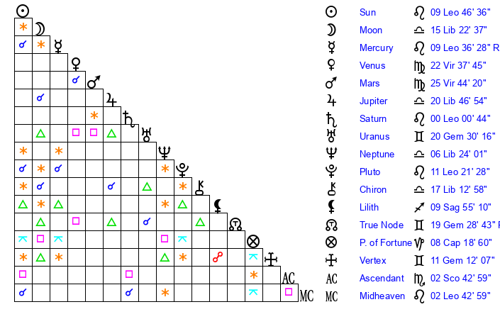 | Mercury | 9 Leo 36 | 7 Leo 45 | 18 Scorpio 15 |