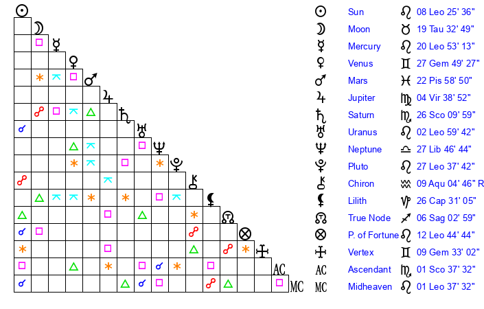 | Moon | 19 Taurus 25 | 29 Libra 51 | 11 Sagittarius 16 |
