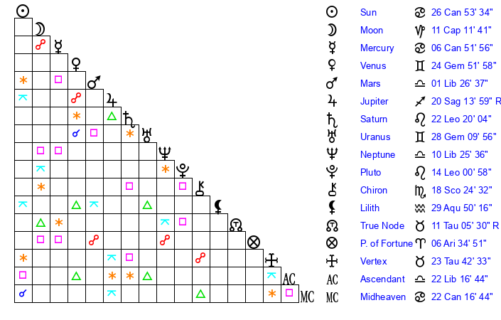 | Sun | 26 Cancer 54 | 27 Cancer 16 | 11 Libra 22 |