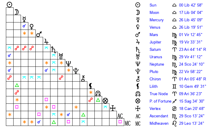 | Moon | 17 Libra 1 | 21 Libra 57 | 18 Scorpio 32 |