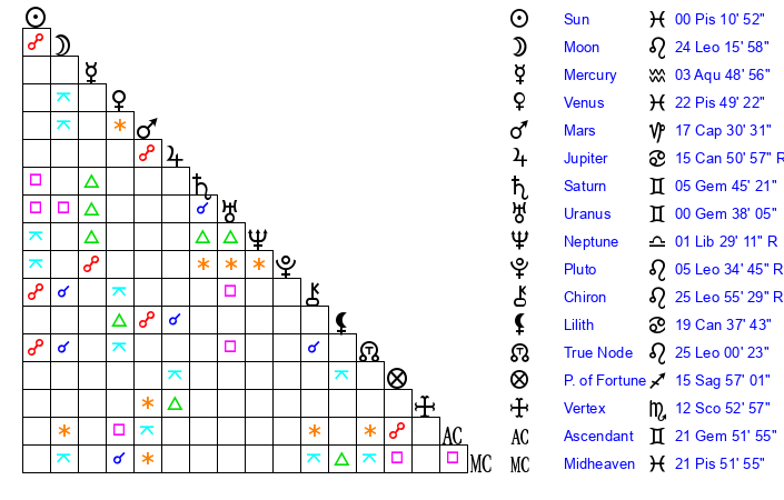 | Moon | 24 Leo 19 | 19 Scorpio 53 | 24 Leo 12 |