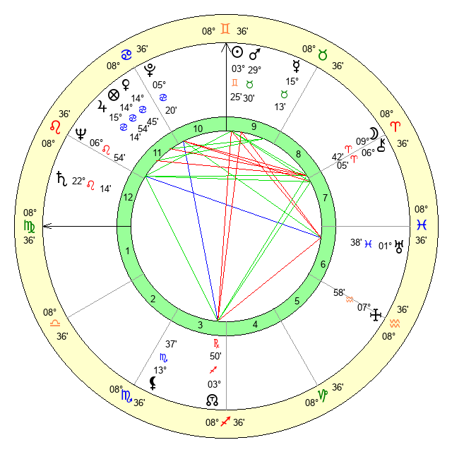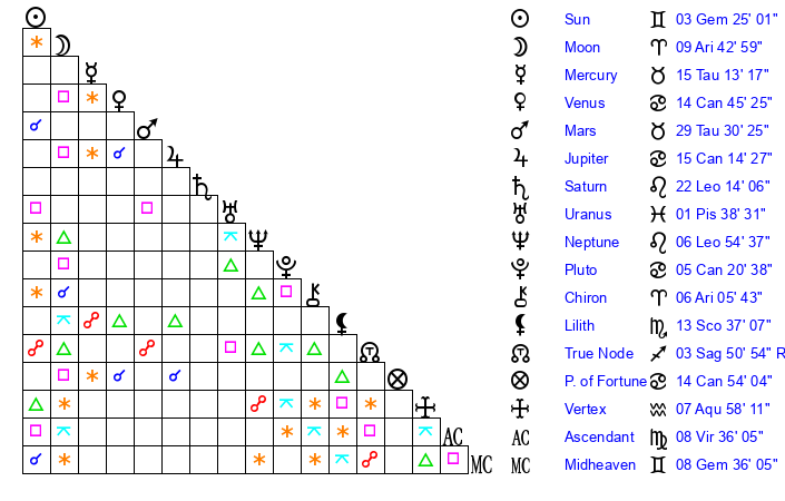 | Sun | 3 Gemini 25 | 4 Gemini 44 | 14 Virgo 58 |