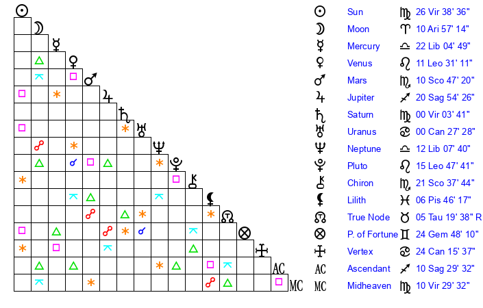 | Sun | 26 Virgo 39 | 27 Virgo 0 | 13 Sagittarius 29 |