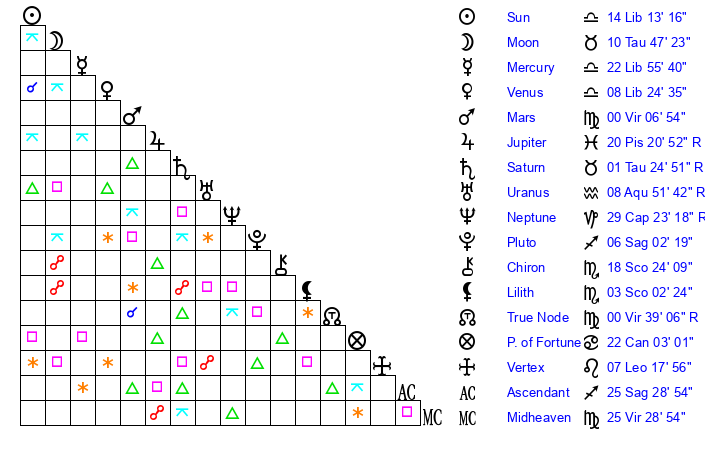 | Sun | 14 Libra 13 | 14 Libra 41 | 11 Scorpio 4 |