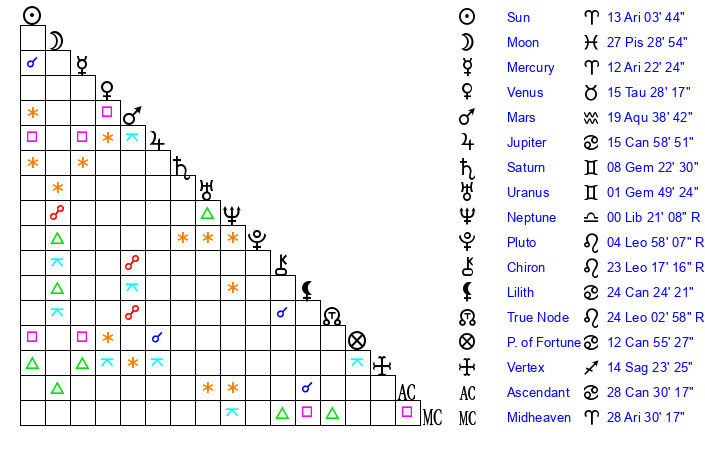 | Mars | 19 Aquarius 39 | 24 Cancer 31 | 20 Aries 39 |