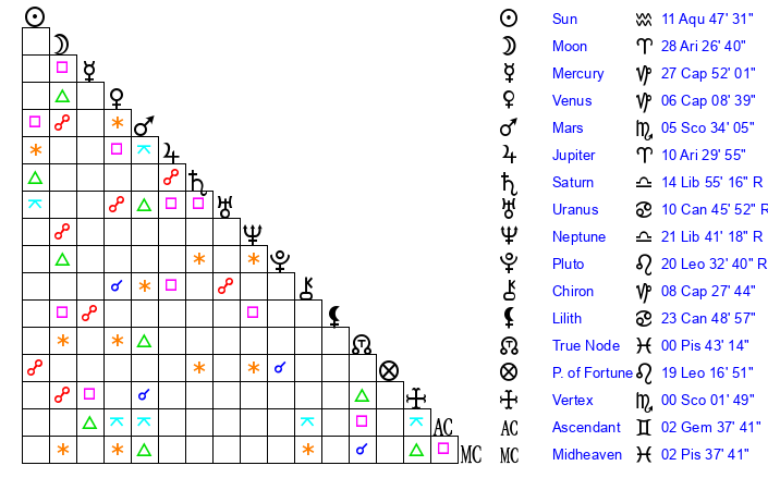 | Sun | 11 Aquarius 47 | 13 Aquarius 5 | 24 Aries 41 |