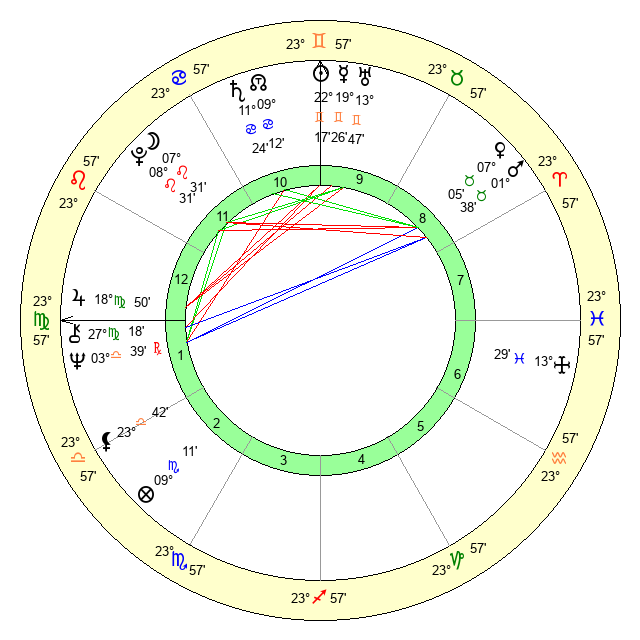 | Jupiter | 18 Virgo 40 | 0 Cancer 53 | 1 Libra 23 |