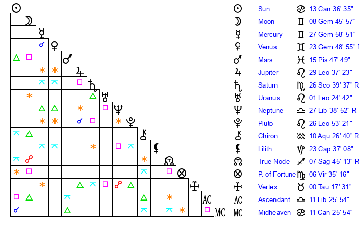 | Venus | 23 Gemini 48 | 1 Gemini 10 | 4 Leo 26 |