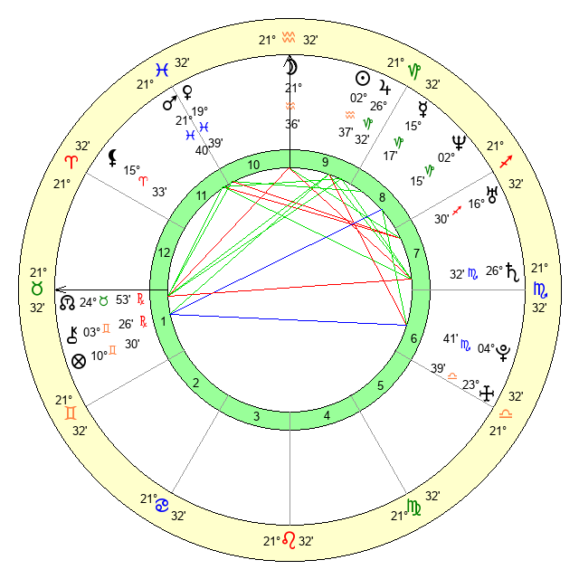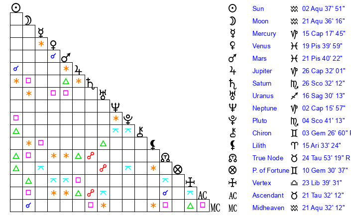 | Moon | 21 Aquarius 34 | 12 Scorpio 2 | 27 Cancer 24 |