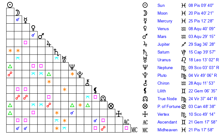 Venus | 8 Aquarius 40 | 10 Aries 44 | 28 Aries 40 |