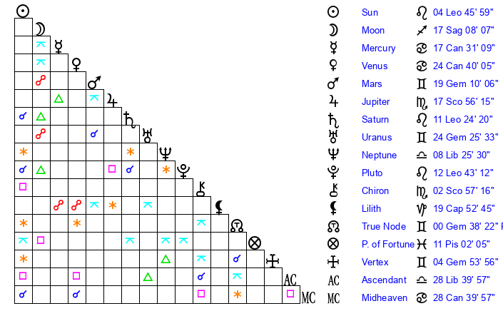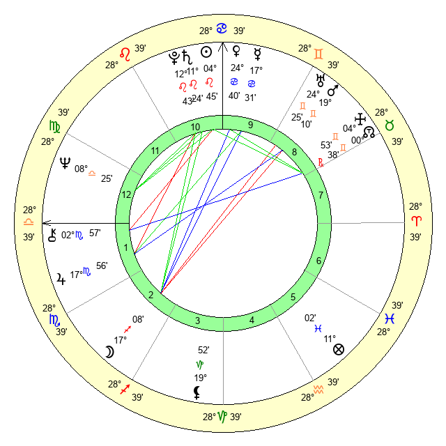 | Venus | 24 Cancer 40 | 27 Gemini 10 | 1 Scorpio 25 |