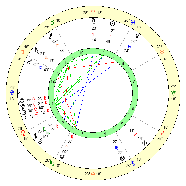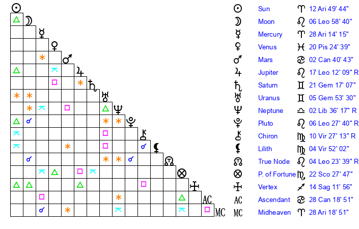 | Moon | 6 Leo 58 | 12 Gemini 27 | 24 Cancer 31 |