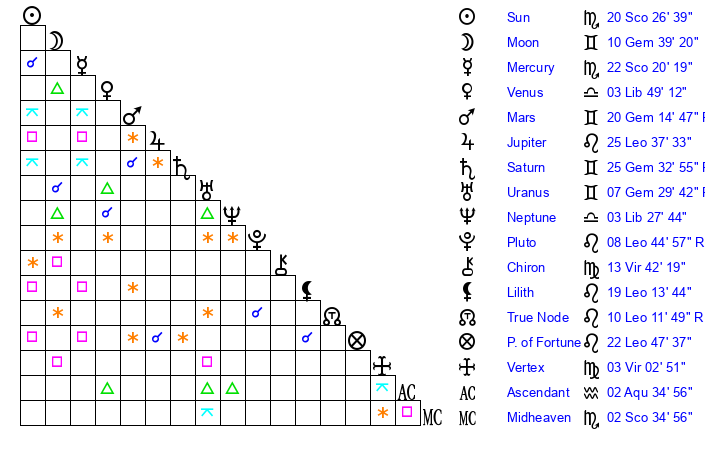 | Moon | 10 Gemini 38 | 9 Virgo 1 | 12 Gemini 36 |