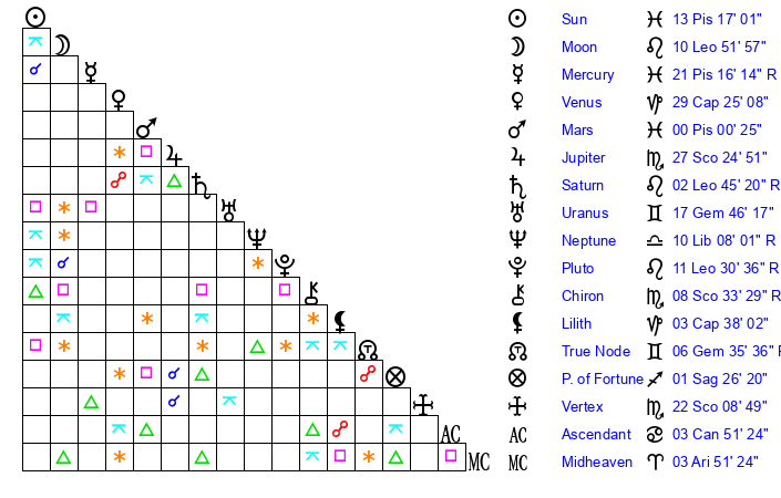 | Saturn | 3 Leo 14 | 21 Pisces 4 | 4 Leo 22 |