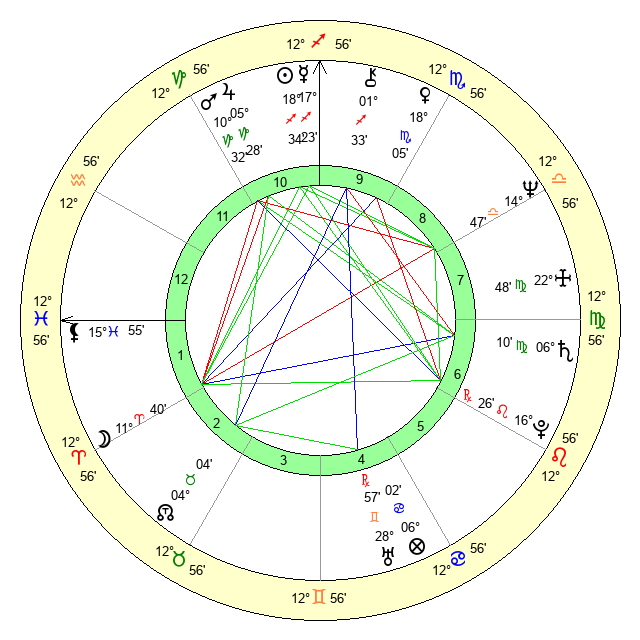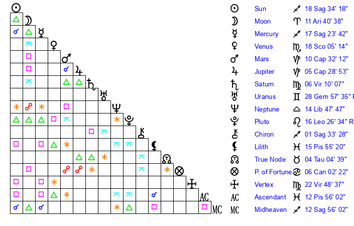 | Moon | 11 Aries 43 | 5 Virgo 12 | 12 Aquarius 52 |