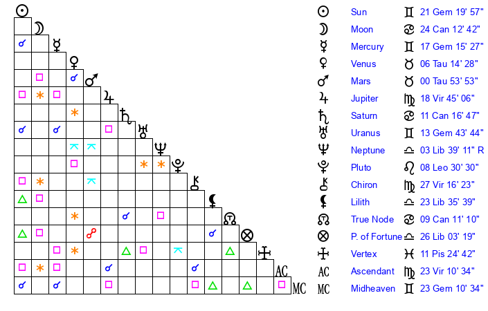 | Sun | 21 Gemini 20 | 21 Gemini 58 | 7 Virgo 54 |