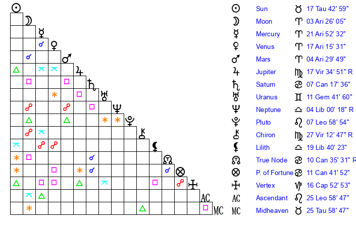 | Sun | 17 Taurus 43 | 18 Taurus 21 | 4 Leo 16 |