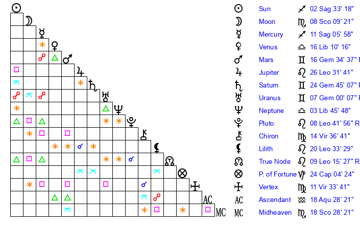 | Sun | 2 Sagittarius 33 | 3 Sagittarius 41 | 25 Aquarius 54 |