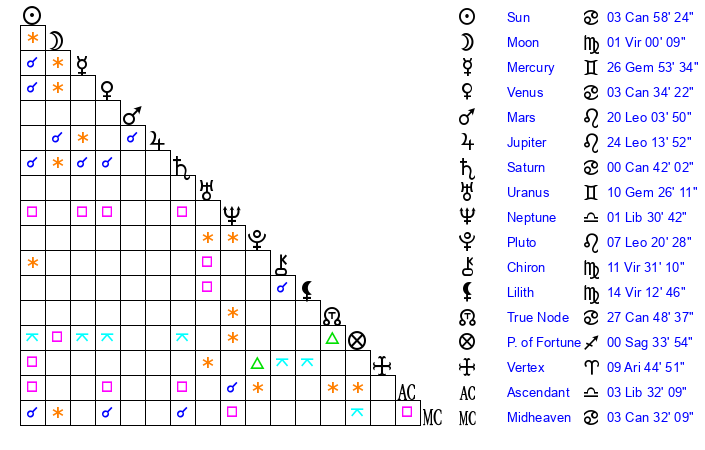 | Mercury | 26 Gemini 54 | 28 Cancer 33 | 8 Virgo 43 |