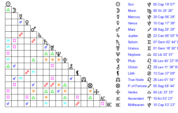 | Moon | 0 Virgo 23 | 5 Aries 7 | 15 Virgo 6 |