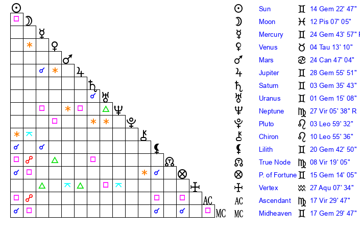 | Mercury | 24 Gemini 44 | 23 Gemini 15 | 24 Virgo 38 |