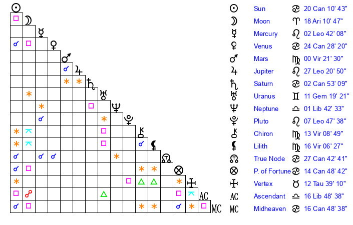 | Moon | 18 Aries 9 | 12 Aquarius 59 | 1 Aries 35 |