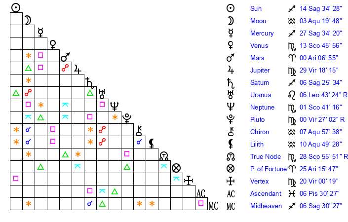 | Sun | 14 Sagittarius 34 | 14 Sagittarius 49 | 24 Aquarius 44 |