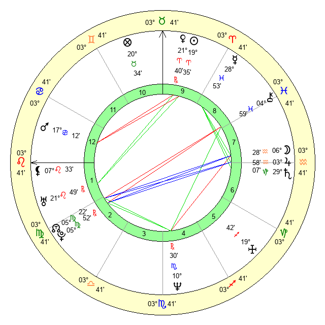 | Moon | 6 Aquarius 32 | 13 Virgo 48 | 15 Gemini 23 |