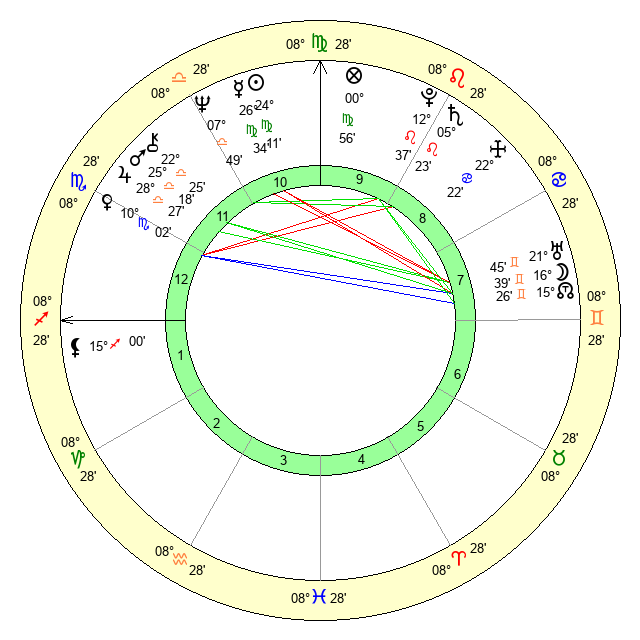 | Moon | 16 Gemini 30 | 6 Leo 20 | 0 Taurus 47 |