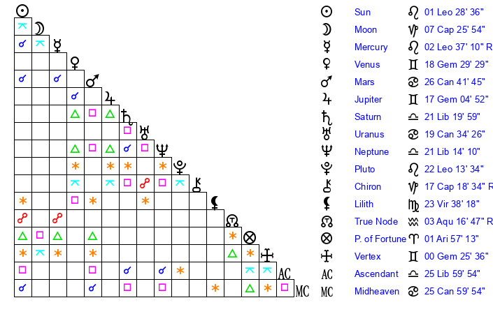 | Mercury | 2 Leo 36 | 13 Leo 53 | 0 Scorpio 1 |