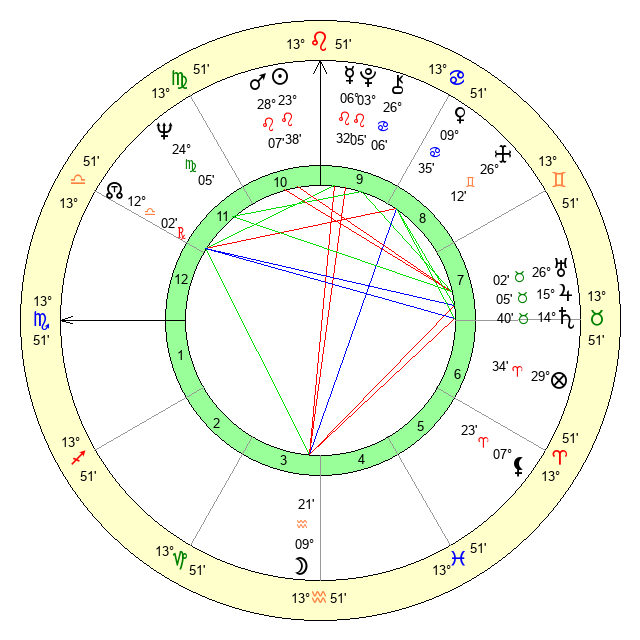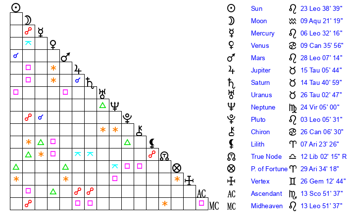 | Sun | 23 Leo 38 | 24 Leo 5 | 17 Scorpio 9 |
