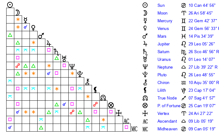 | Moon | 26 Aries 49 | 9 Libra 59 | 20 Scorpio 44 |