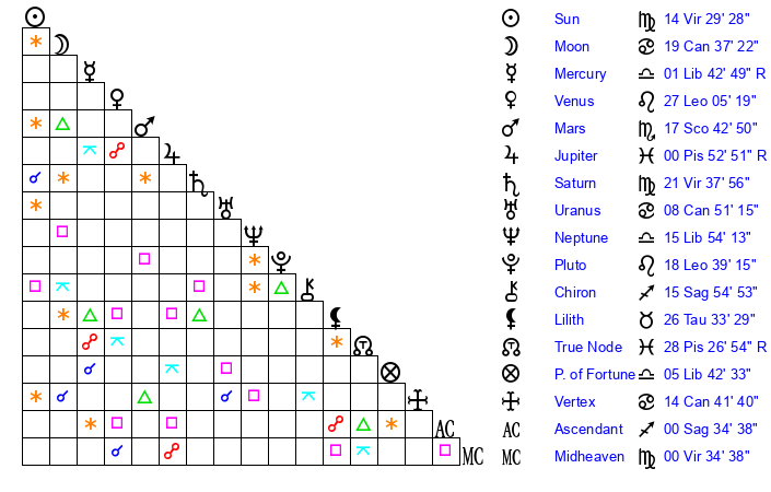 | Sun | 14 Virgo 29 | 15 Virgo 19 | 28 Scorpio 49 |