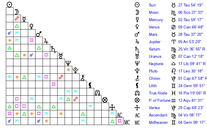 | Mercury | 2 Taurus 59 | 16 Taurus 52 | 5 Virgo 49 |