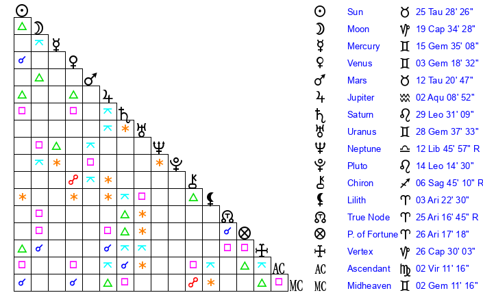 | Moon | 19 Capricorn 38 | 10 Capricorn 50 | 27 Libra 12 |