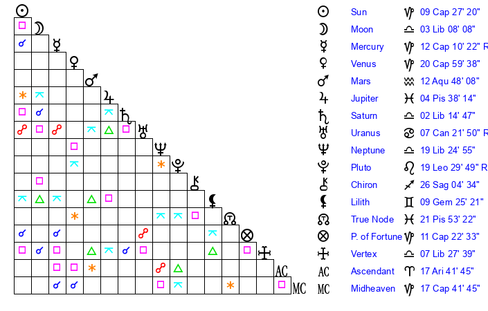 | Mars | 12 Aquarius 48 | 12 Capricorn 28 | 11 Aries 22 |